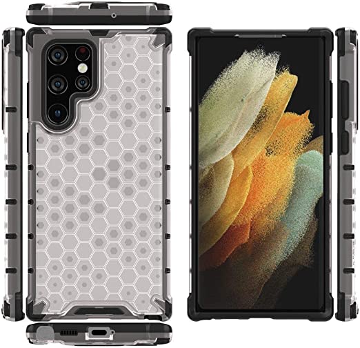 لهاتف Samsung Galaxy S22 Ultra, جراب اصلي مقاوم للصدمات بنمط خلية النحل من GrabologyStore - ابيض شفاف
