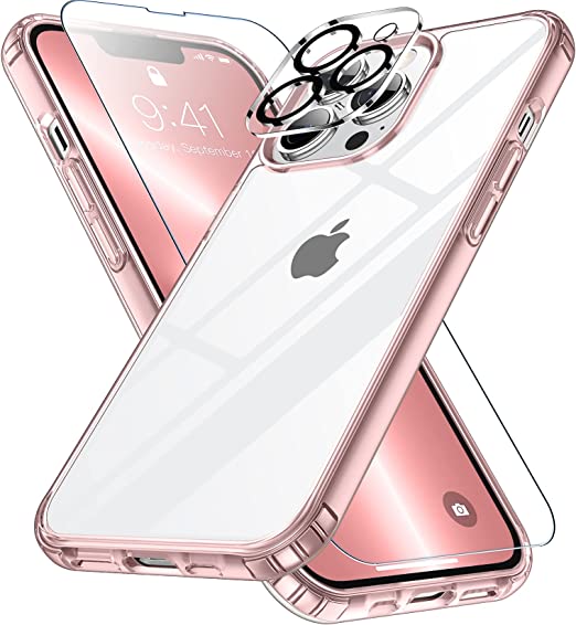 JUSTCOOL [3 IN 1] Designed for iPhone 13 Pro Case, [Crystal Clear Not Yellowing] [with 2 Pcs Tempered Glass Screen Protectors & 2 Pcs Camera Lens Protectors] Slim Thin Case (Pink/Clear)