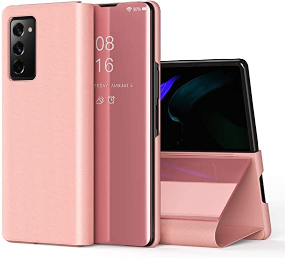 LEMAXELERS Compatible with Galaxy S21 FE Case Slim Mirror Design Clear View Flip Bookstyle Ultra Slim Protecter Shell with Kickstand Protective Cover for Samsung Galaxy S21 FE Mirror PU Rose Gold